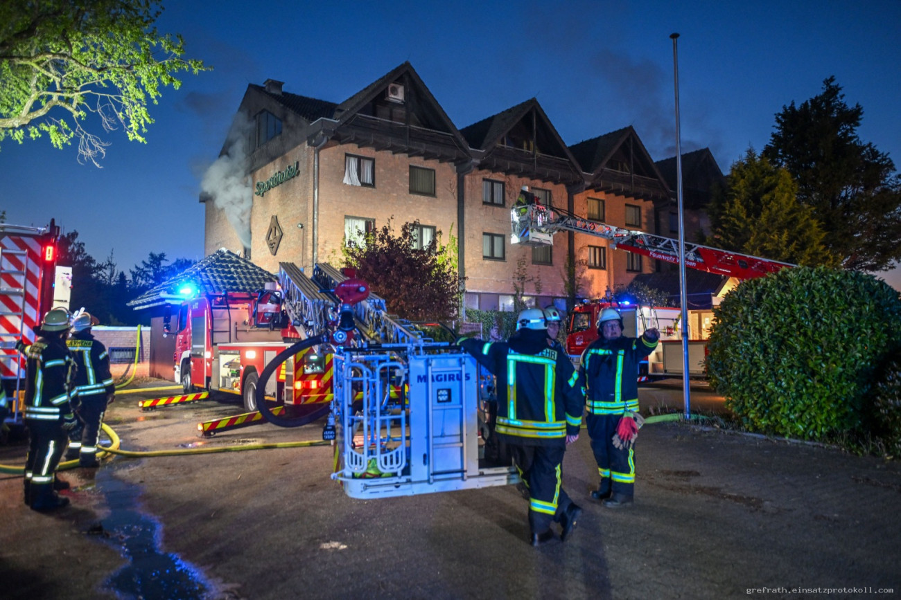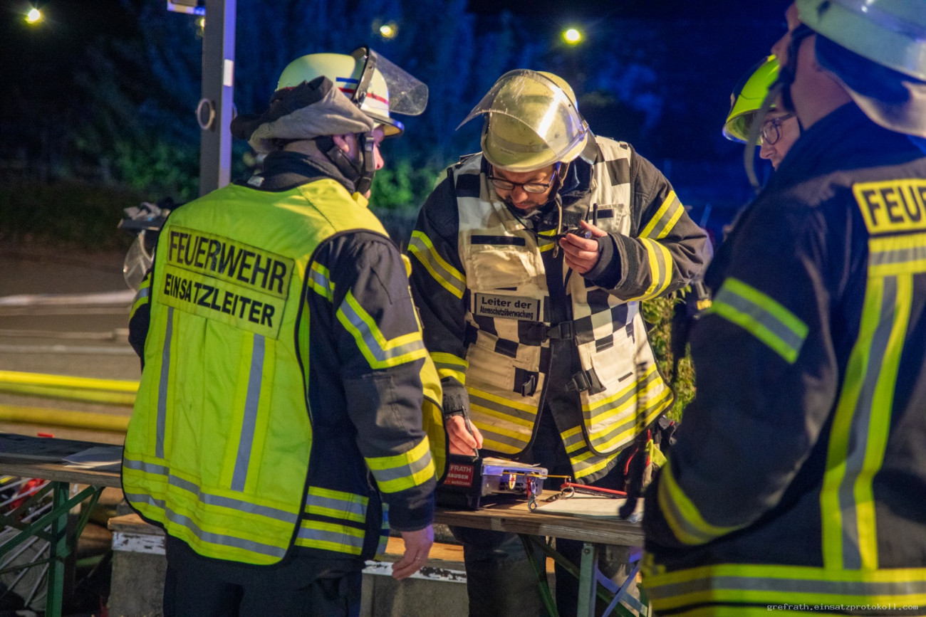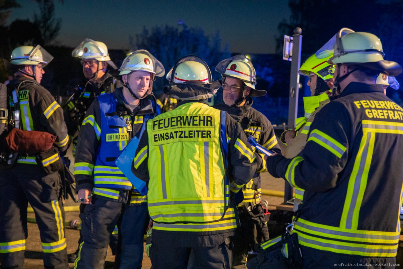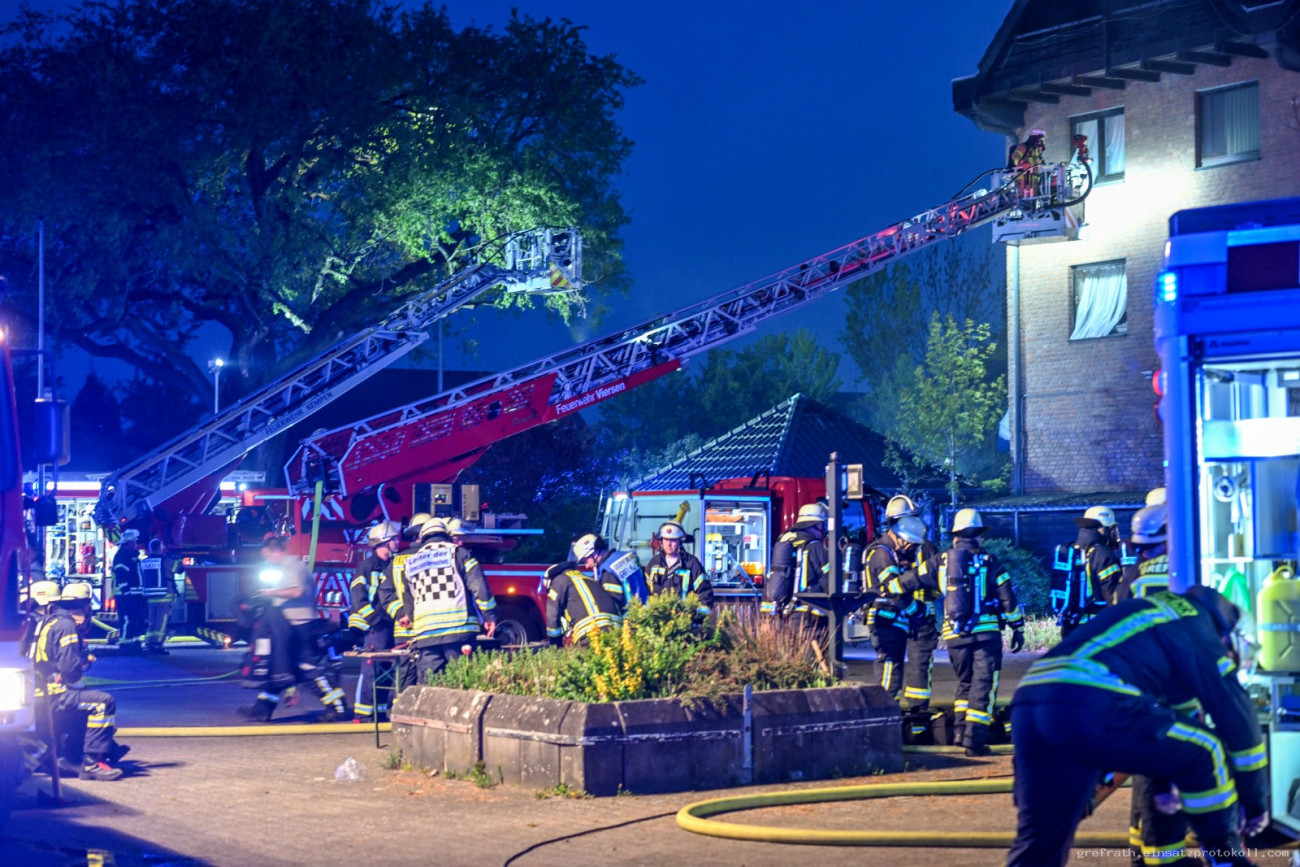 Gegen 20.35 Uhr wurde die Gesamtwehr Grefrath, der Rettungsdienst aus Kempen und die Drehleiter des Löschzug Süchteln mit dem Stichwort Wohnungsbrand alarmiert. Vor Ort wurde Feuerschein aus dem 1. Obergeschoss gemeldet. Vier Trupps unter Atemschutz starteten mit der Brandbekämpfung. Der Einsatzleiter forderte auf Grund der Gegebenheiten die Drehleiter aus Kempen nach. Mehrere Geschosse des Gebäudes waren stark verraucht. Weiterhin erfolgte über Nina eine Warnung der Umgebung über Rauch und Brandgeruch. Der Atemschutzgerätewagen des Kreises Viersen versorgte die Einsatzkräfte mit weiteren Atemschutzgeräten. Der ABC Erkunder des Kreises Viersen nahm in der Umgebung Messungen vor, konnte aber keine kritischen Werte feststellen. Ein Rettungswagen des DRK und ein Krankentransportwagen des MHD lösten den Rettungswagen und Notarzt aus Kempen ab. Insgesamt 19 Trupps unter Atemschutz bekämpften das Feuer und befreiten das Gebäude vom Rauch. Insgesamt waren 25 Fahrzeuge mit 96 Einsatzkräften im Einsatz. Zudem wurden die Gemeindewerke Grefrath zur Einsatzstelle bestellt. Nach Beendigung aller Maßnahmen wurde die Einsatzstelle der Kripo zur Brandermittlung übergeben. Wir sagen Herzlichen Dank allen Einsatzkräften, die bei diesem Einsatz die Feuerwehr Grefrath unterstützt haben.